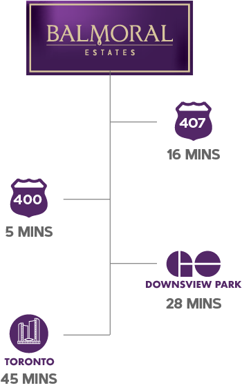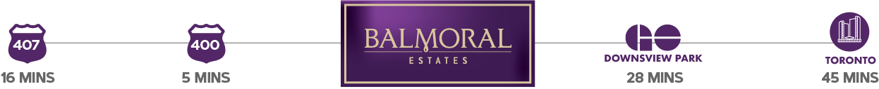 Located at Pine Valley Drive and Teston Road in the heart of prestigious Vaughan, you are steps from magnificent golf courses, nature trails and open spaces. Urban amenities abound, from big box stores to everyday essentials, cafes, bakeries and fine restaurants. Enrich your kids’ experiences with top schools, libraries, community centres, arenas and sports grounds. Live your best life at Balmoral Estates.